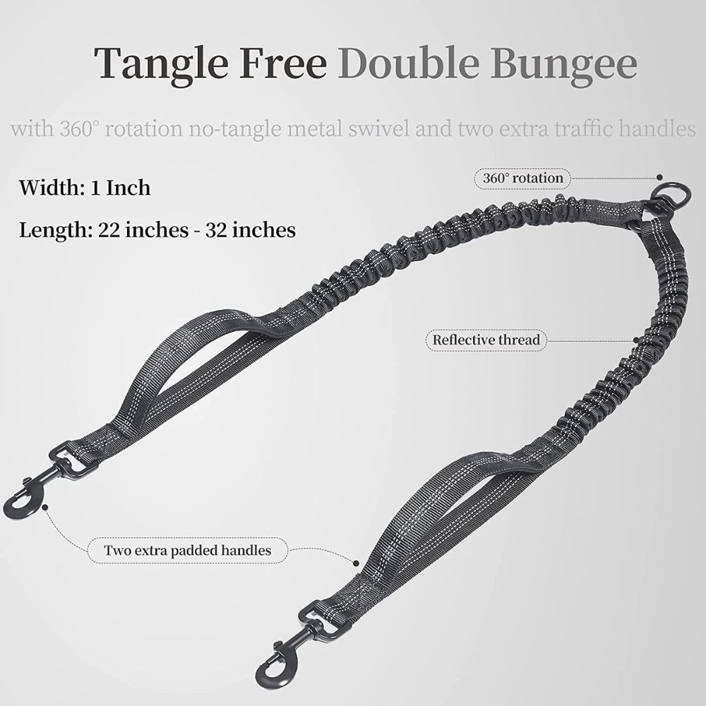 The climbing rope and tightly woven nylon bungee extension make the double leash more durable, while the 360° swivel clasp design prevents tangles.